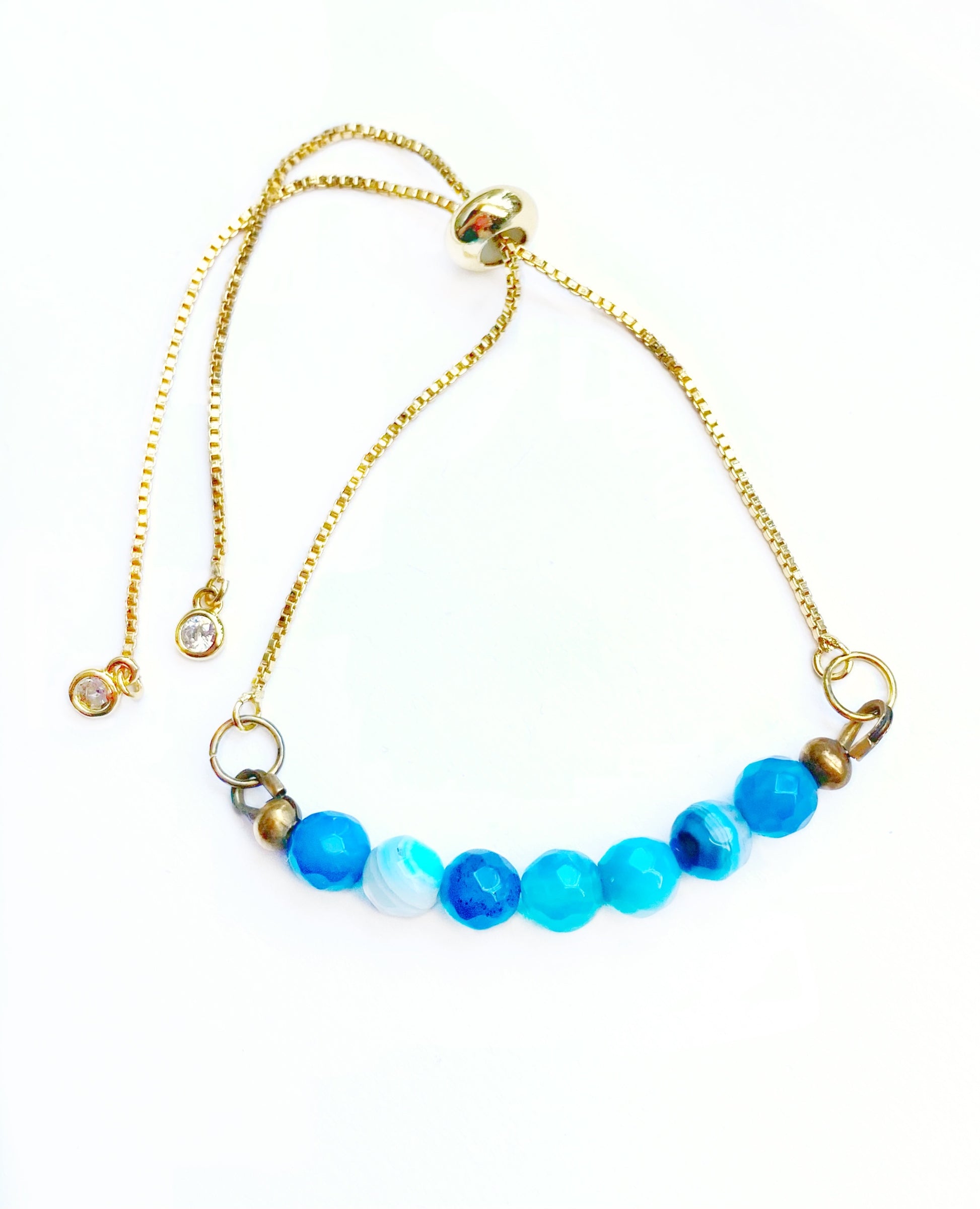 Flash some bling with this one-of-a-kind Gold-Plated Boho Bracelet. With 14K gold-plated adjustable sliding box chain and attention-grabbing dangles of cubice zirconia bezelled stones, it’s perfect for making a style statement. And it’s topped off with those classic yet vibrant faceted Blue Agate Gemstones – giving you a look that’s as unique as you are!
