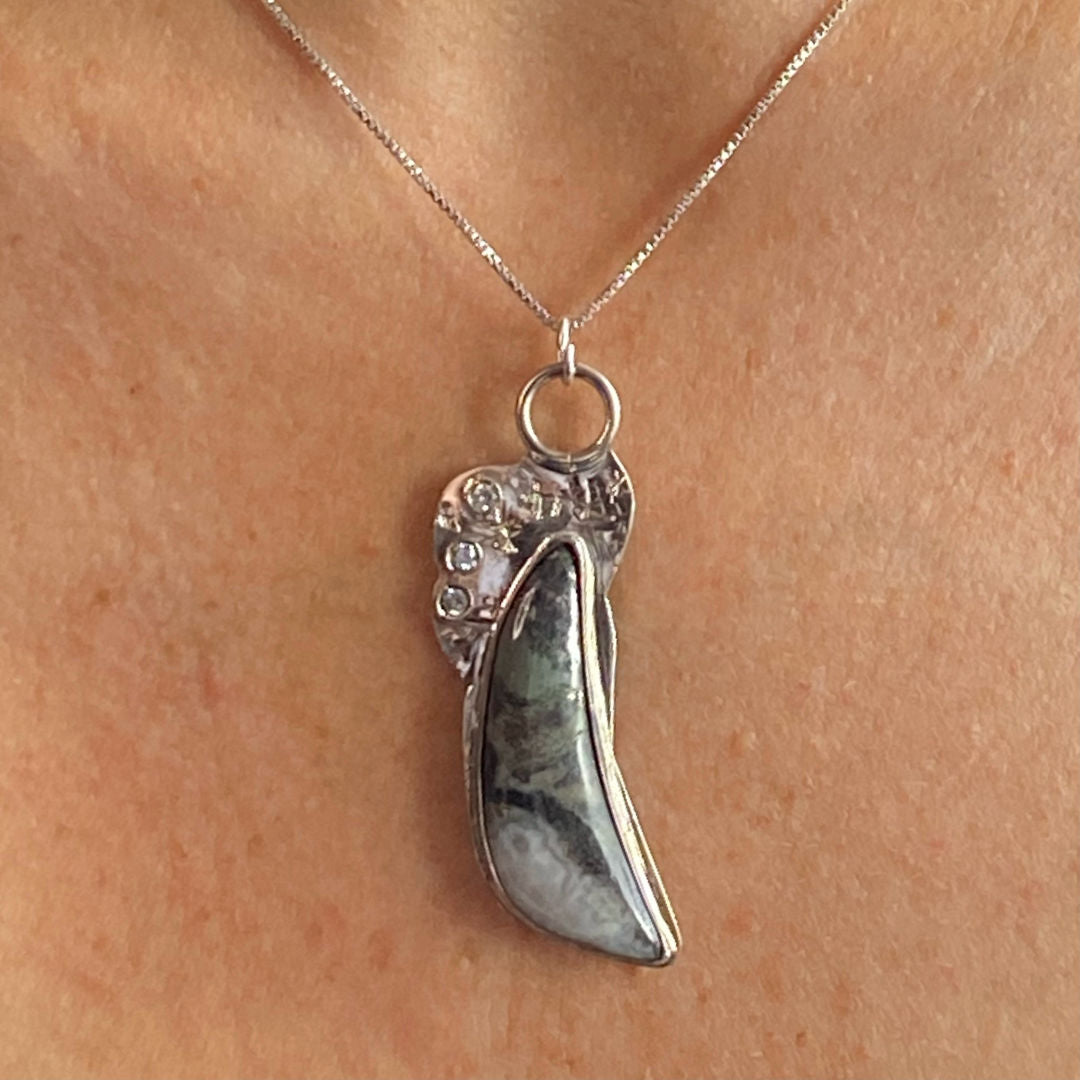 Jadeite & Agate, CZ, Sterling Silver Etched Necklace