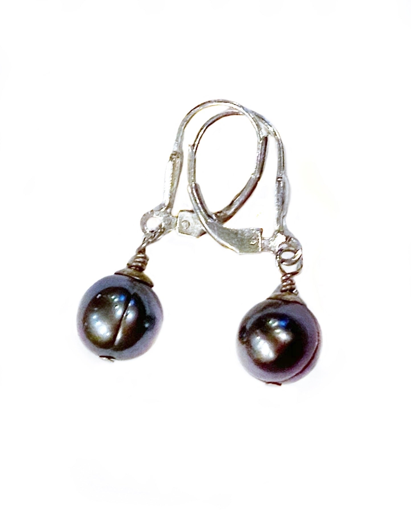 Peacock-coloured fresh-water pearls hang from stirling silver leverback earrings