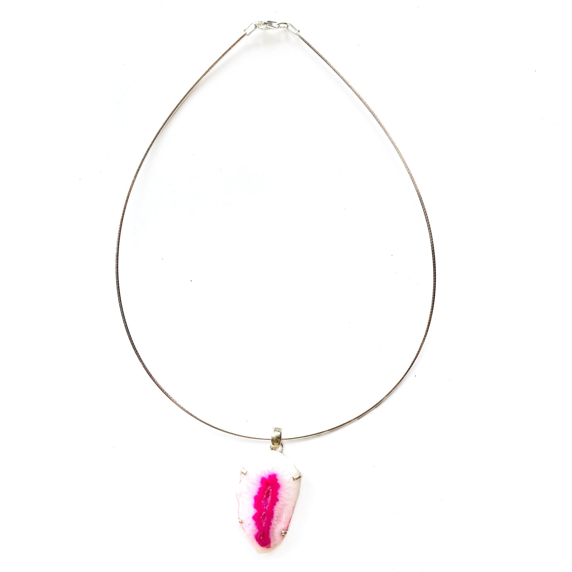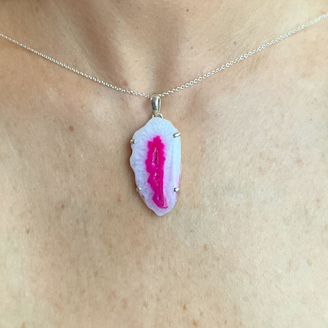 Sterling Silver claw bezel and bail featuring a 15mm Fuchsia & White organically shaped geode