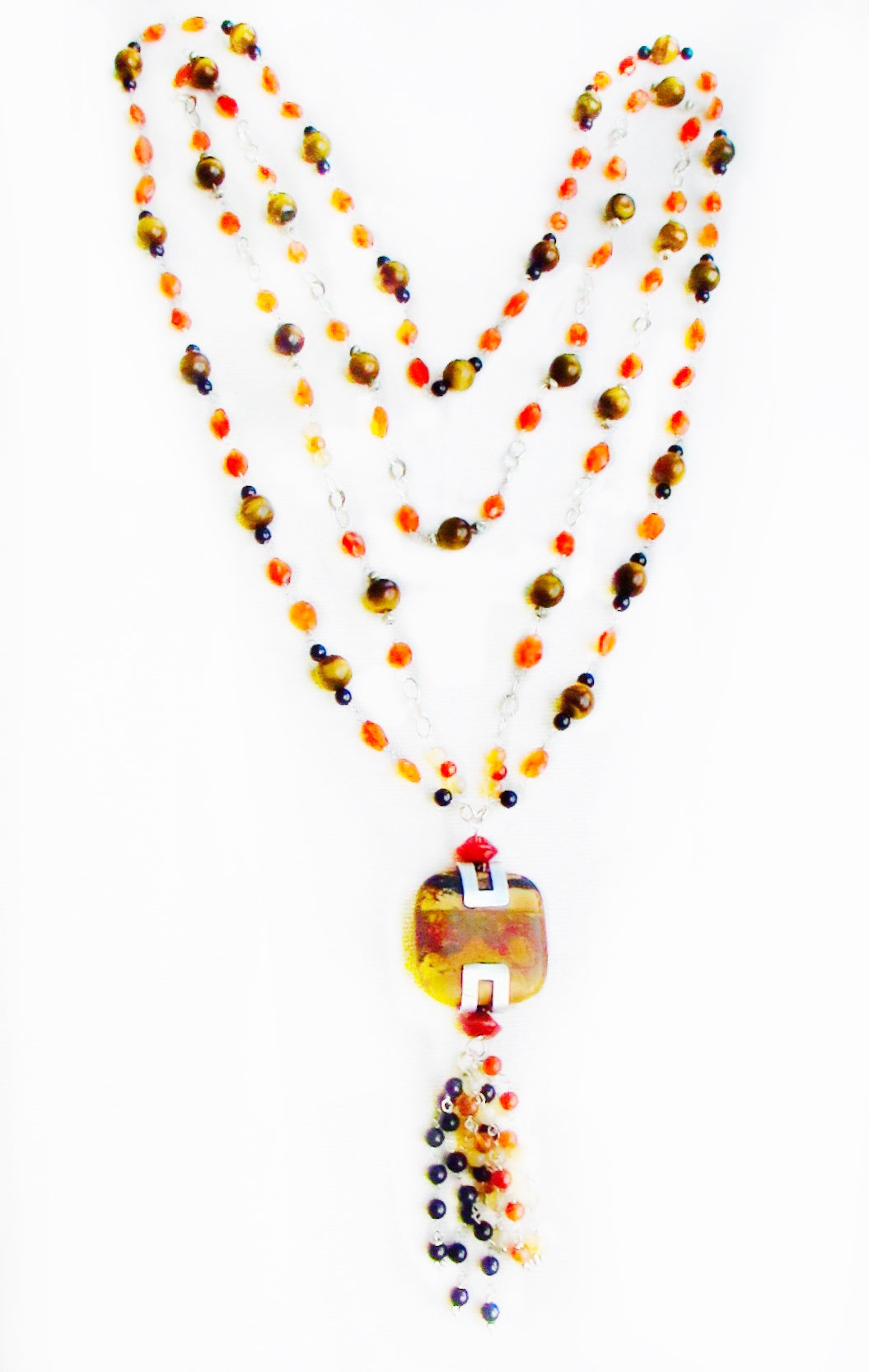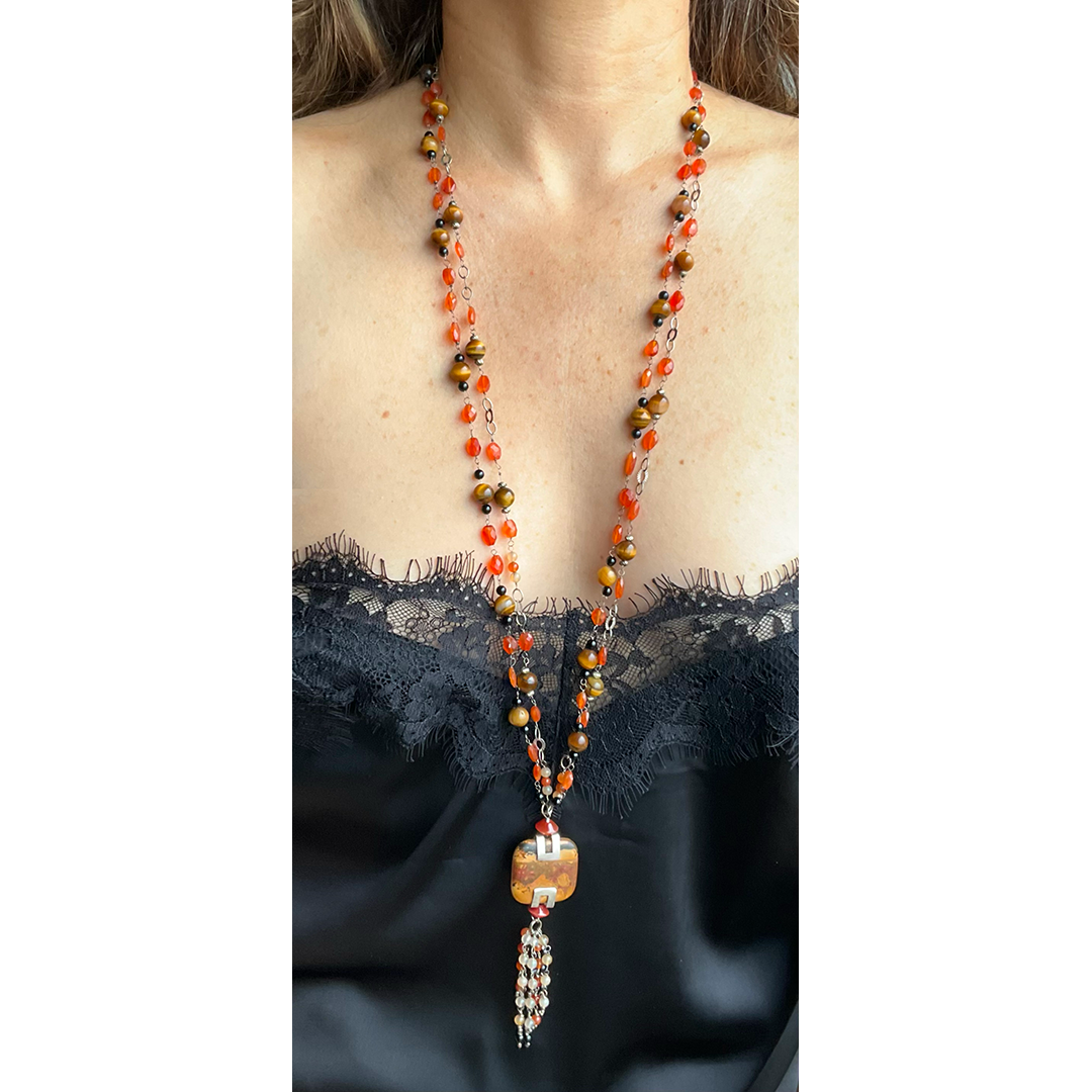Sterling Silver delicate links connect faceted beads of Carnelian, Tiger Eye and smooth black Onyx to create an Opera Length One-of-a-Kind Necklace