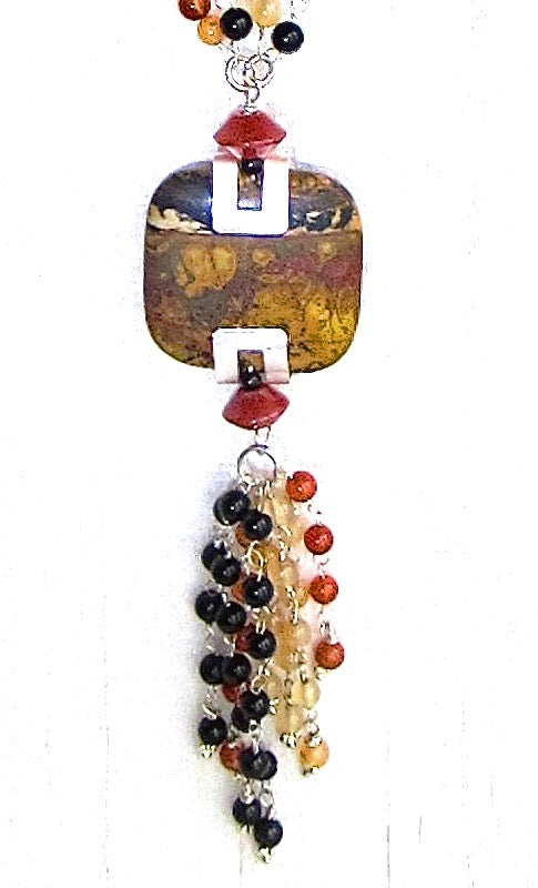 Focal Point at opera length is a square rounded Noreena Jasper Cabochon with a tass medley of gemstone beads