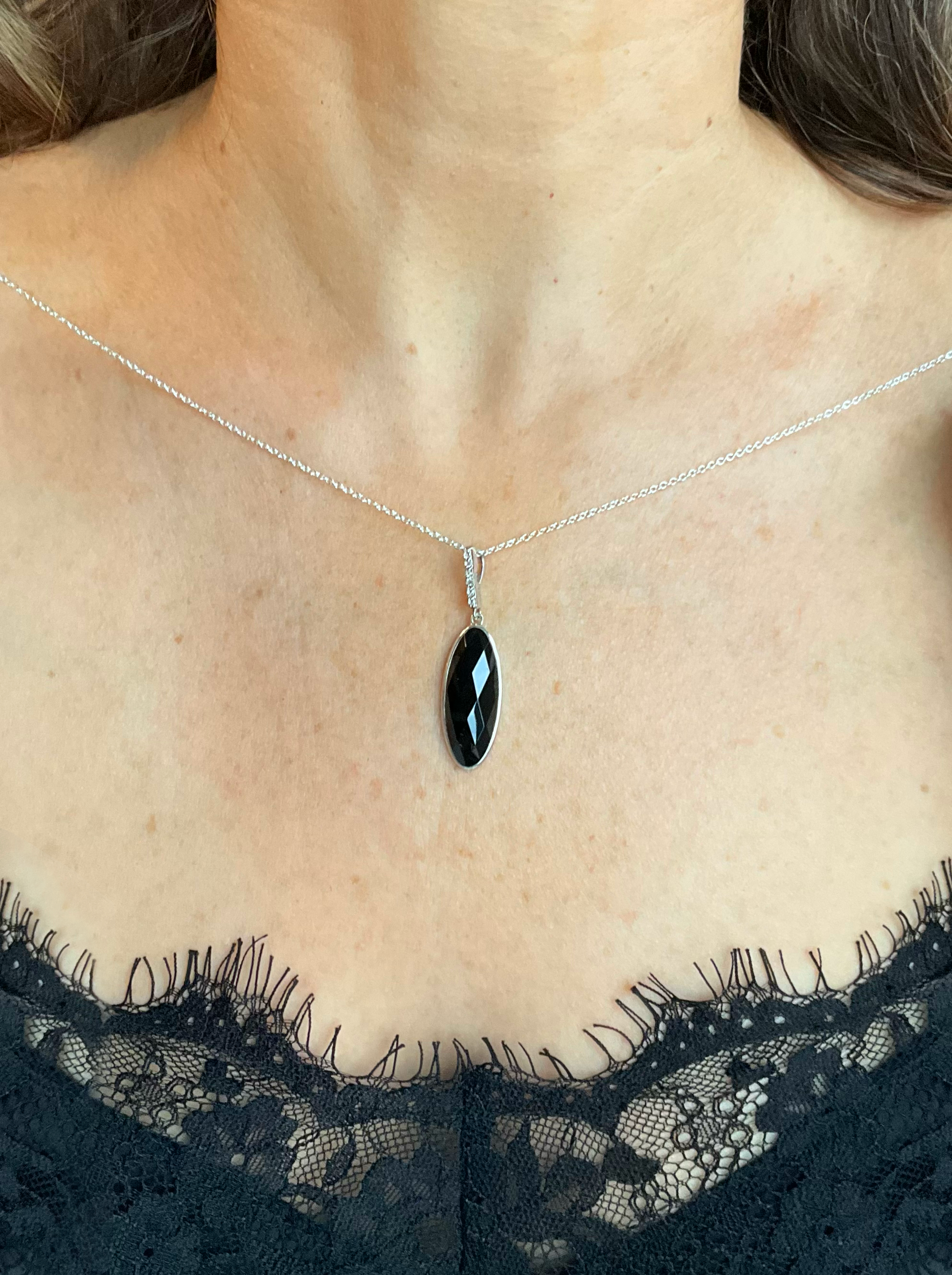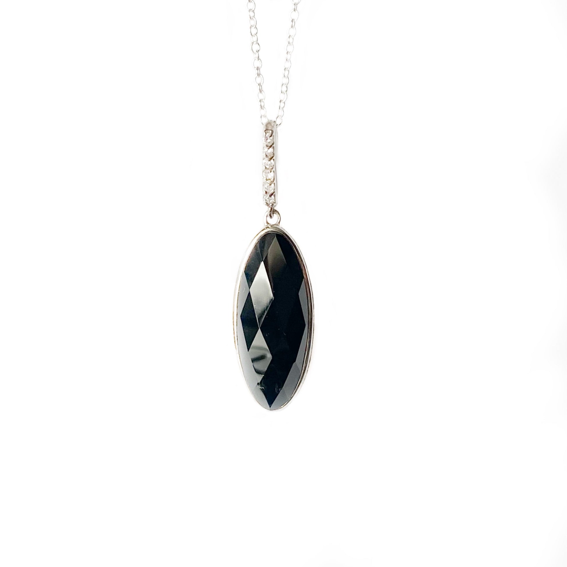Sterling Silver bezel holds an oblong faceted marquise cut onyx gemstone