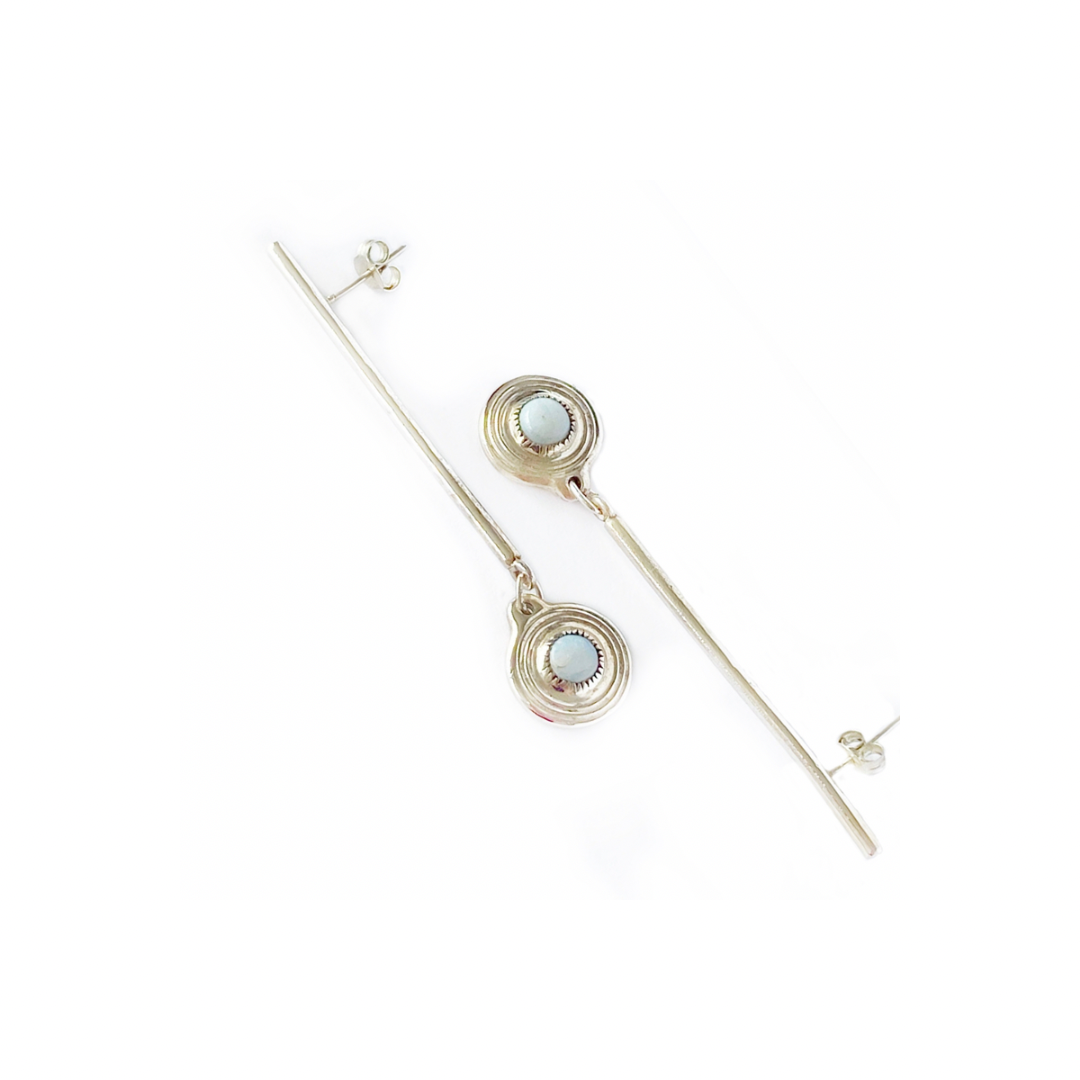 Silver Decorated Circles set with 4mm Opals hang from Long Silver Smooth Sticks Stud Earrings